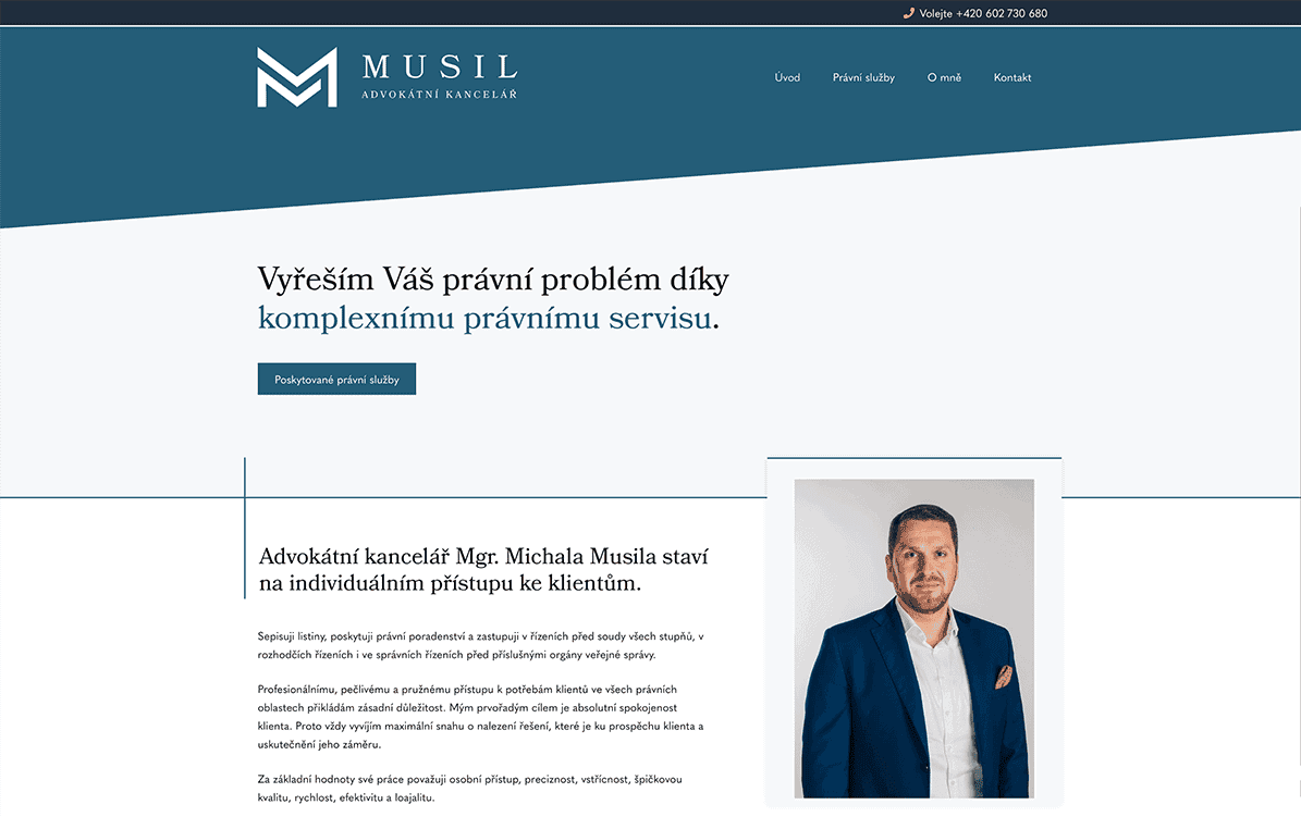Webová vizitka pokrývá základní potřeby advokátní kanceláře – od popisu poskytovaných služeb ke kontaktním údajům. Vizuální styl je spíš konzervativní, ...